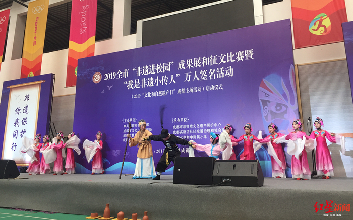 活动现场,“非遗进校园”传统表演艺术展演集中展示了10所学校和机构的12个节目,涉及金钱板、川剧、四川清音、木偶长绸舞等非遗项目。