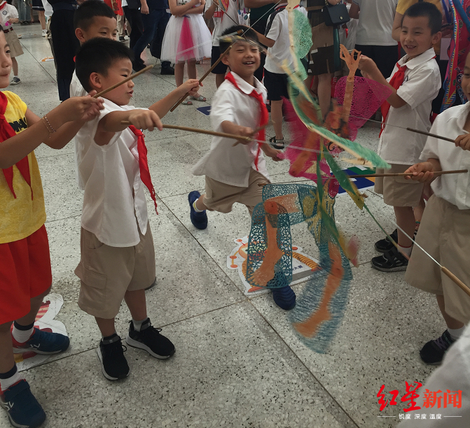 随后,成都市木偶皮影剧团带来了木偶长绸舞《人偶情韵》,令全场学生看呆了,甚至手里拿的糖画都忘了吃,目不转睛地盯着舞台上木偶长长的红绸舞动,观众席不时发出赞叹声和喝彩声。