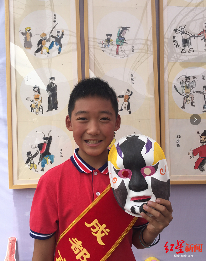 成都市兴盛小学校的学生正在向观众介绍,“我们学校的非遗特色是川剧。看,这是我们的特色脸谱,那边的学生正在按照书上的脸谱知识进行绘制呢。这边有成品,还可以戴在头上哦。纸伞的伞面也是川剧元素,绘画采用的是防水材质,平时还能折叠起来,非常实用。川剧扑克牌、吊坠、抱枕等等,都是学生自己制作的。”