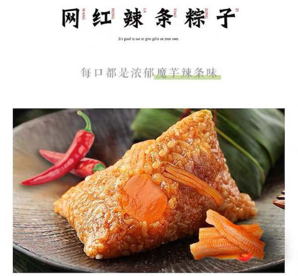 相信很多人的童年记忆中不会少了辣条这个红遍大江南北的零食。今年一家商家就十分聪明地将“辣条”带入了粽子界。五月底,辣条粽子在网络平台上一上市就被抢购一空,多次补货。看来人们对于辣条的情节还是十分深重的啊。辣条粽子将原料为魔芋粉的辣条加入到咸蛋大肉粽当中,并且将粽子制作成香辣口味。不少购买的网友都是辣条的忠实粉丝,他们满怀着好奇心下单订购,表示都想尝尝鲜。