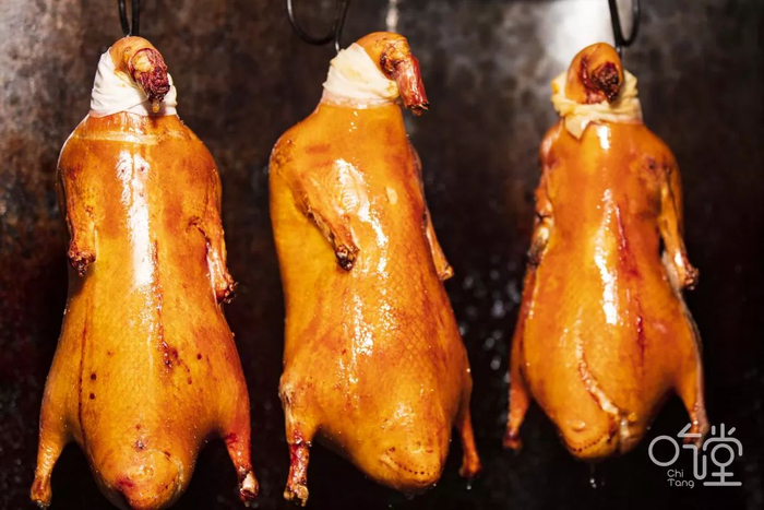 烤鸭用挂炉烤制,能使鸭子受热均匀,随着炉温升高,鸭坯变色,脂肪融化,“滋滋”冒油时,诱人的香味满店都是。