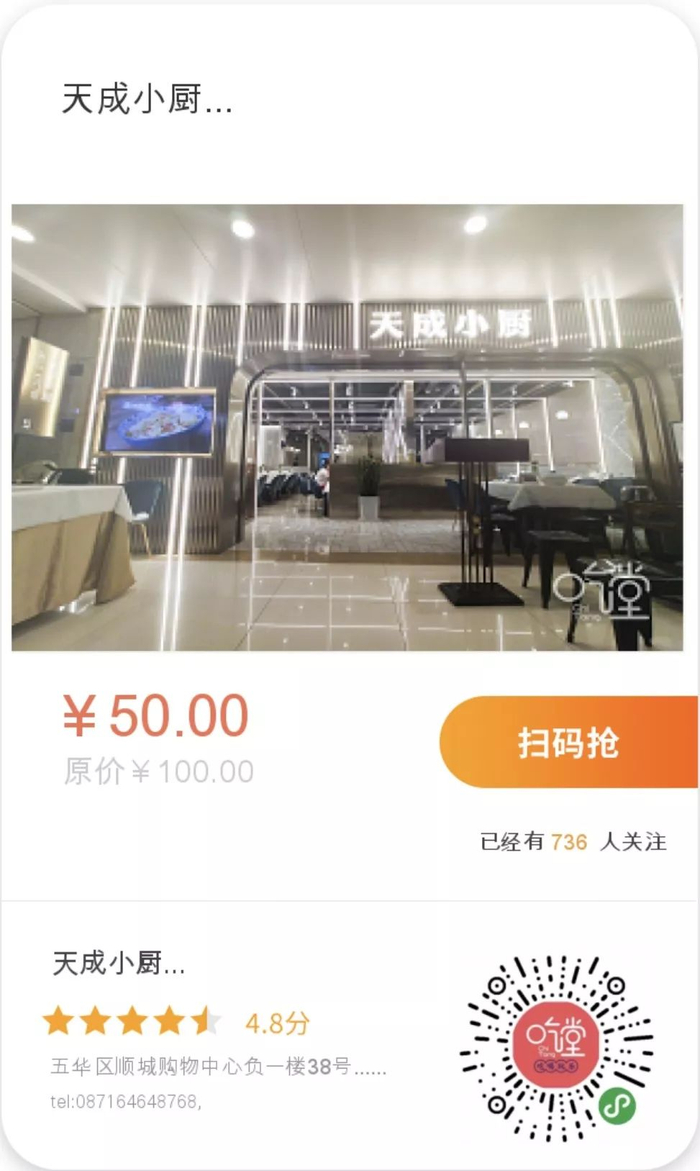 50元购天成小厨100元代金券(不设找补,不可同时参与店内其它优惠活动,一桌限使用1张)
