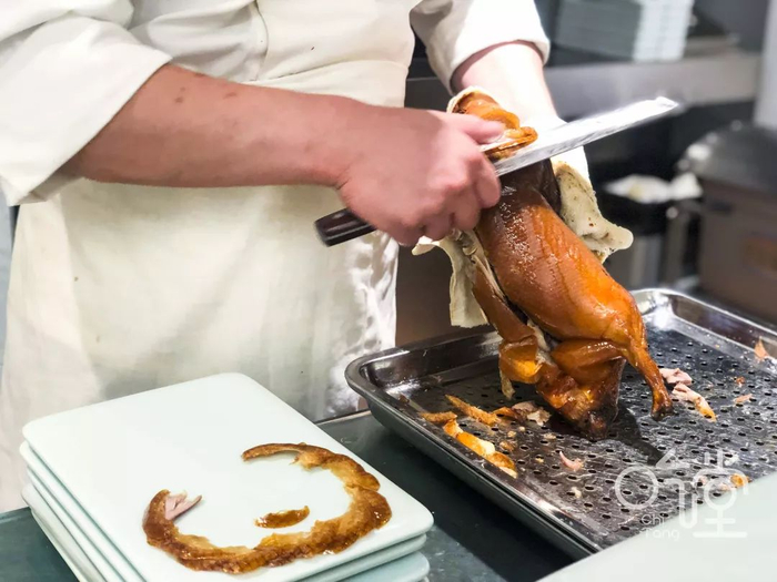 要吃到风味最佳的烤鸭,烤鸭师傅对火候的掌控和刀工都很重要。天成小厨特地从北京请来了5位师傅,要的就是正宗。