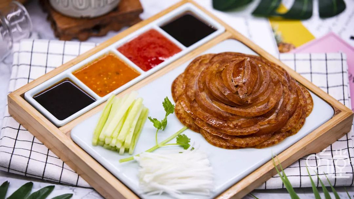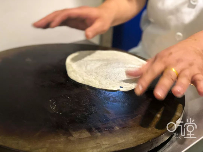 天成小厨的面饼分两种,厚饼面香绕口,落口消融,薄饼柔软劲道,薄到可以透光却不易撕碎。