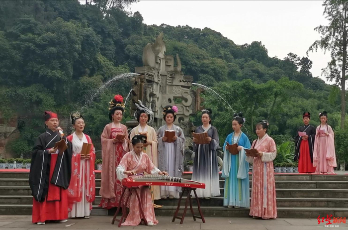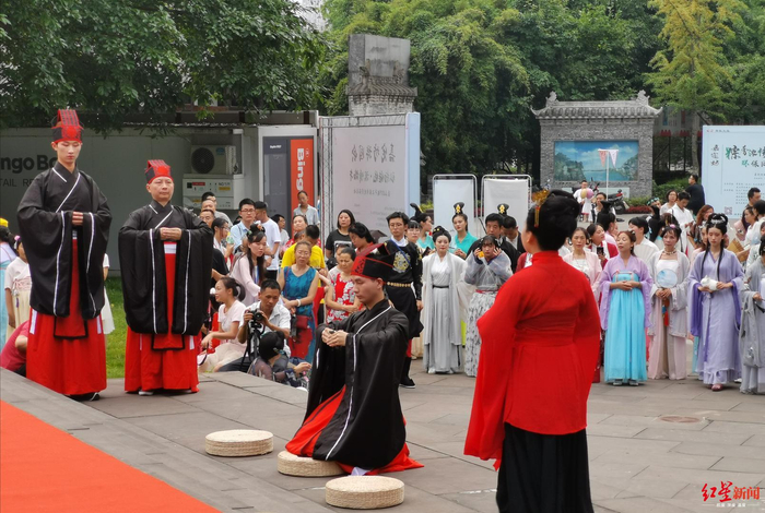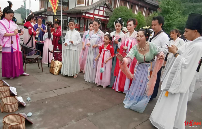 在沐兰汤后,近百位汉服爱好者共同参与纪念屈原活动。在庄重典雅的祭祀活动现场,上香献酒、诵祭文,大家盛赞屈原一生的丰功伟绩,尽诉对其的敬仰缅怀之情,而吟唱《橘颂》、舞蹈《宫墙柳》、古琴《流水》、合唱《重回汉唐》等节目充分展示了汉文化魅力。