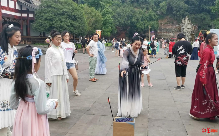 除了汉服表演和传统礼仪展示,汉服爱好者们还邀大家一起体验点雄黄、系香囊、射五毒、投壶等端午节传统民俗活动。游客王女士感慨地说,“以前只知道端午节吃粽子、系五彩绳、挂艾蒿,没想到端午节还有这么多习俗。”