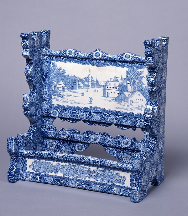 “从异国情调迈向现代世界”单元则呈现了欧亚艺术在日本本土化的结果。去过神户的人,对北野异人馆的特色建筑应不陌生,《摄州神户海岸繁荣图三联作》中让人得以想象神户1868年作为国际港湾城市的繁华景象。素胎上施以白化妆土再以蓝彩(青料)描绘图样的“京阿兰陀”软陶,则是从荷兰德夫特陶器得到灵感,此类作品在当代陶艺界也很受到喜爱,《蓝彩西洋风景图刀架》是目前已知结构最复杂的作品。