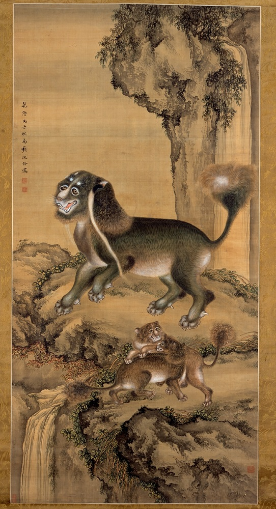 展览中这件沈南苹《狮子戏儿图》描绘了狮子一家站在瀑布流经的岩石上的场景。大狮子的两耳有白色的细长鬃毛、尾巴前端蓬松,身旁有两只打闹的小狮子。大狮子为墨绿色鬃毛、小狮子鬃毛则以褐色为主,并以泥金线细密描绘,象征狮子的特殊性。以细皴表现岩石肌理、土坡施以点描、并强调浓淡变化等,是南苹画风的特征。描绘大小狮子,即有“太师少师”的吉祥主题。这种以谐音呈现吉祥寓意的手法,深受江户时代的人们喜爱。画面左上有落款“乾隆丙子秋南苹沈铨写”,推测是沈南苹于乾隆二十一年(1756年)返回中国后的作品。