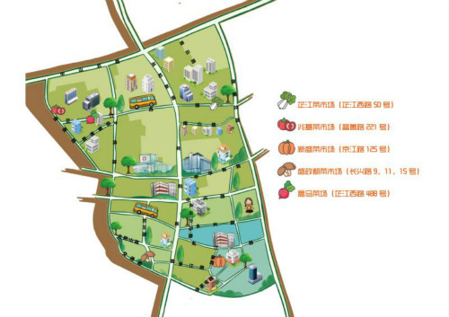 与此同时,街道辖区内也兴建了许多新的商业设施,其中新建、改扩建的菜市场,或以供应菜类商品为主的商业网点就超过了10家。为方便居民就近购买新鲜、美味、丰富、实惠的菜品,打造便捷的15分钟生活圈,街道党工委、办事处组织相关科室和市场监管部门,在广泛调研的基础上,绘制了指南式的“菜场地图”。