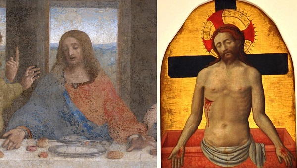 左图:达·芬奇《最后的晚餐》中的耶稣形象;右图:安东尼奥·维瓦利尼《忧患之子》(《圣母加冕》祭坛画局部)(1449年,祭坛画,尤弗里西苏斯圣殿)