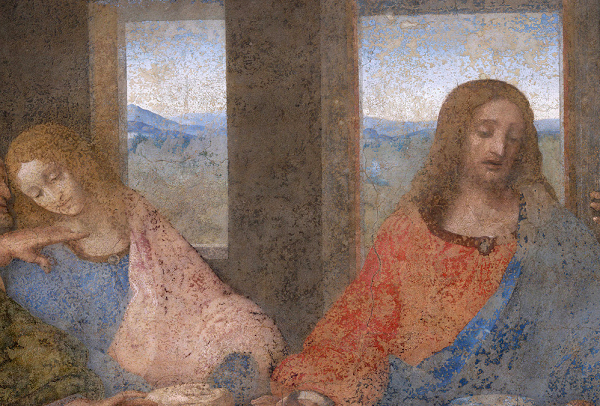 2003年,美国作家丹·布朗创作了一部畅销小说《达·芬奇密码》,书中揭露了一段不为人知的“秘密”:耶稣与抹大拉的马利亚秘密结婚并生有一子,他们的子孙有可能至今仍活在这个世界上。抹大拉的马利亚作为耶稣最虔诚的女性追随者,曾用极贵的膏油浇灌耶稣,用头发为耶稣洗脚,见证耶稣的复活,但这并不足以证明她就是耶稣的秘密妻子。于是丹·布朗试图在达·芬奇的《最后的晚餐》中寻找“证据”:耶稣右手边的那个一头卷发、没有胡须的“女子”。耶稣身穿蓝色袍子、红色内衣,而这位“女子”刚好反过来,穿着红色袍子、蓝色内衣;从姿态上,耶稣靠向画面的右边,而这位“女子”却靠向画面的左边,两人的轮廓完美地构成了一个“M”,暗喻了“婚姻”(Mat-rimonio)。