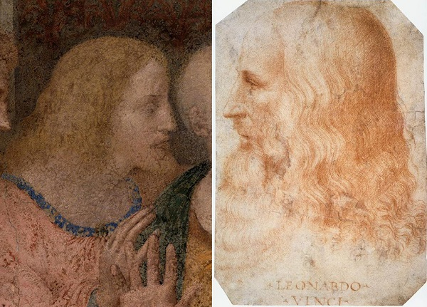 对于《最后的晚餐》这样一幅重要的作品,达·芬奇当然不会将自己“缺席”。英国畅销书作家罗斯·金在与《最后的晚餐》创作同时期的一首诗中发现了这个秘密。这首诗出自达·芬奇的朋友加斯帕洛·维斯孔蒂,他们都同时为斯福尔扎家族服务。在这首诙谐的小诗中,维斯孔蒂带有一丝嘲讽的口吻,取笑一位不具名的艺术家将自己画入了他的作品中,并且还有“不论他有多么的英俊”这样的话语。众所周知,年轻时候的达·芬奇是一个绝世美男子,乔治·瓦萨里在《大艺术家传》里形容他拥有“天赐的容颜、优雅和才华”。虽然瓦萨里没有见过达·芬奇本人,但是他曾在梅尔兹的宅邸中看到他为达·芬奇所绘的一幅肖像画,而梅尔兹是达·芬奇的爱徒,在达·芬奇去世后继承了他大部分珍贵的收藏。如果拿这幅肖像画与《最后的晚餐》中的人物进行比对,那么画面中的小雅各(左起第二个人)极有可能便是达·芬奇本人的形象。