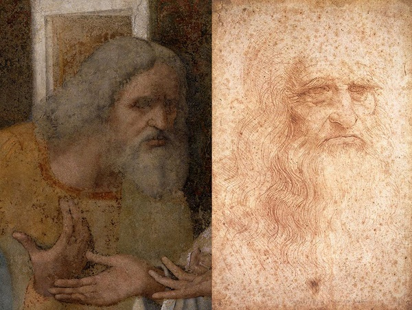 在文艺复兴时期,艺术家将自己的自画像融入到他们最重要的作品中是一种非常流行的做法。与达·芬奇同一时代的吉兰达约在《牧羊人朝拜》中将自己画成前来朝拜刚降生不久的小耶稣的牧羊人之一。拉斐尔在《雅典学院》中不仅将自己画入其中,而且还加入了当时最具声誉的两位大师。因为拉斐尔素来仰慕达·芬奇,也深受其影响,所以将达·芬奇画成了古希腊最重要的哲学家柏拉图的形象;然而,由于拉斐尔不得不忍受米开朗基罗持续不断的妒忌、蔑视和怒火,所以他“以牙还牙”,将米开朗基罗化身为孤僻的古希腊哲人赫拉克里斯。