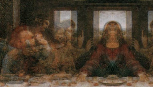 将《最后的晚餐》镜像叠加在原作上面,疑似在耶稣身前出现圣杯