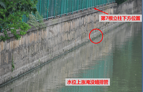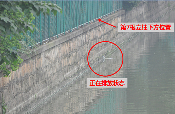 当时已经近四十天连续的晴天,由于一直没有降水,毅嘉厂区旁边河道水位下降很多。我对伙伴说,“看到没,石墙那里有根小水管在排水,还有少量泡沫”,“没有啊,在第几根柱子那里呀?”。我的伙伴们站在桥上,足足瞅了几分钟才瞅见这一根小管。