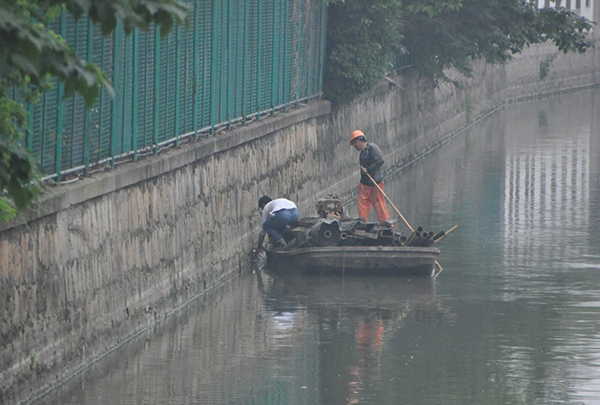 不过这根水管离河岸大概有100米左右,怎么取到水管排放的水体成了一个难题。当务之急是寻到一只小船。沿着河道向东,我们在距离排放口下游2公里的地方找到一只没有动力的水泥船。看似短短的距离,两个人逆流足足划了一个小时才到排口进行取样,现场取样的废水呈淡绿色,检测pH值2-3呈强酸。我凭着多年调研的经验判断这废水里一定含有重金属铜,像是电镀车间排放的电镀液。于是我们将水样送至检测机构进行检测。