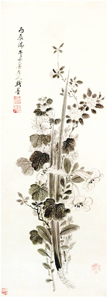 民间常在端午节这天把菖蒲和艾草捆在一起插于檐下,这种行为有时也被升级为高雅的插花艺术,许多古代文人还视插花为端午文化的核心。明末清初画家王时敏的《端午图轴》为纸本墨笔,纵100.8厘米,横40.1厘米,现藏于北京故宫博物院。此作为王时敏为端午节所作的节令画,描绘了菖蒲、蜀葵、玉簪以及蔷薇等几种初夏的时令花草。该图所绘花卉笔墨简练洁净,清新古雅。本幅款署:“丙辰端午西庐老人戏墨”,下钤“王时敏印”“西庐老人”,鉴藏印有“桐阴馆藏”“陆润之鉴藏”二方,丙辰为清康熙十五年,王时敏时年85岁。