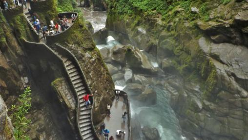 厄瓜多尔的魔鬼之炉瀑布位于安第斯山区。瀑布周围绿树掩映,一道人工挖凿而成的石头阶梯缠绕在山间。阶梯顶端是一个观景台,站在上面可以将周围的美景一览无余。