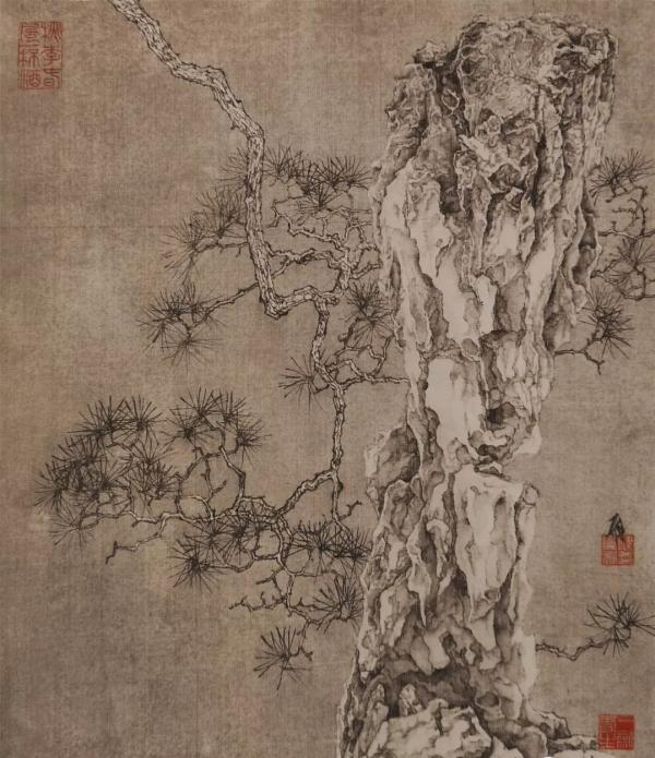 我画山水,喜欢画巍峨高耸的山峰,变幻莫测的烟云,这些都是自然中的大景象。但画多了也会有一种疲劳感,甚至是心与手的双重疲劳。这时,我也会置身在自己的一间小书房中,信手裁剪一块手帕大小的绢布,或取自一张废宣纸的空白处,画一颗灵石,或一枝老松。笔和纸的交流一下变得简单起来,但画的道理全在,画完便觉得心灵也通透了。