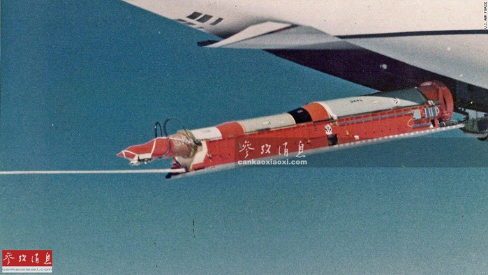 最初提出用运输机以空投方式发射洲际导弹,实际还是出于冷战时期的核打击需要, 能将运输机和洲际导弹两者结合起来,在今天看来都是异想天开的。图为1974年10月24日空射试验当天使用的“民兵III”导弹,为便于观测,弹体采用了橙色涂装,未加装核弹头。