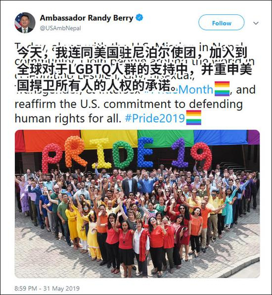 美国驻尼泊尔大使在推特上发了一张照片,照片上他和使馆工作人员举着写有“PRIDE 19”字母的气球