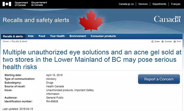 北京时间2019年4月15日,加拿大卫生部在官网发布了召回和安全风险提示,召回6款在售的日本产品,其中4款眼药水因含有处方药盐酸四氢唑啉、甲基硫酸新斯的明和氨基己酸成分,可能引起严重的健康风险。