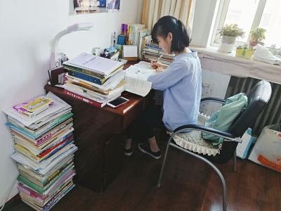 丁丁住的房间面积不大,客厅里、卧室里到处堆放着丁丁的复习资料。丁丁一进门,先把茶几上的习题收到自己的书房。山西晚报记者看到,丁丁的书桌旁摆放着厚厚的一摞复习资料,快要比书桌还要高了。书桌上的资料零散地堆放着,只留下中间一小块空当,刚够放下一张卷子。书桌对面的墙上,贴着电影明星王凯的海报,看得出来,海报已经不那么新了。