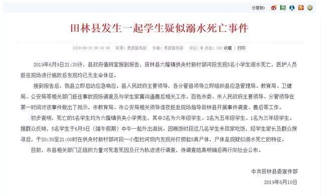 9日21:30许,广西百色市一河段发现5名小学生溺水死亡。初步查明,5名学生均就读同一学校,其中2人为六年级学生、2人为五年级学生、1人为三年级学生。5名学生于当日中午一起外出游玩。目前,死者死因及行为轨迹正在调查。