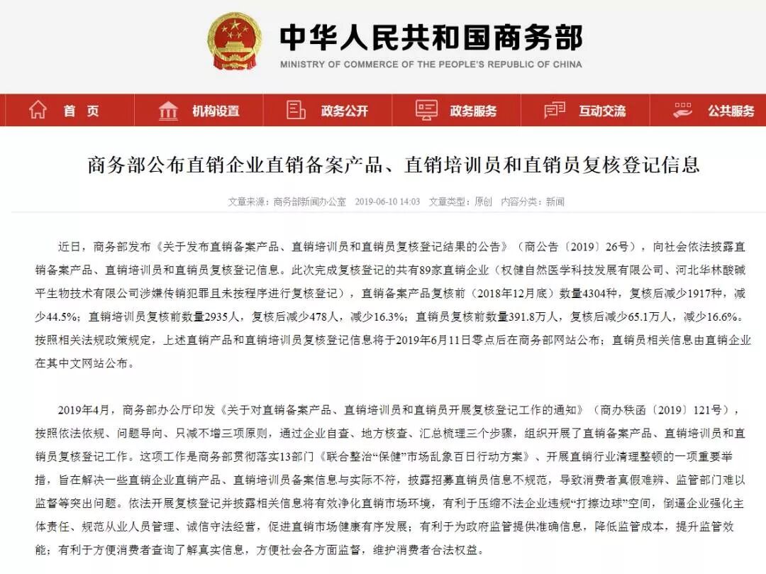 商务部:89家直销企业完成复核登记,权健、华林涉嫌犯罪