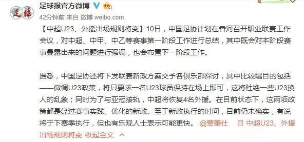 据爆料,足协近期将召开职业联赛工作会议,将微调U23政策,只要求一名U23球员保持在场上即可,这将杜绝一些U23换人的乱象;同时为了与亚冠接轨,中超将恢复4名外援。据悉新政的变更将在下赛季完成,但不排除本赛季开启的可能。