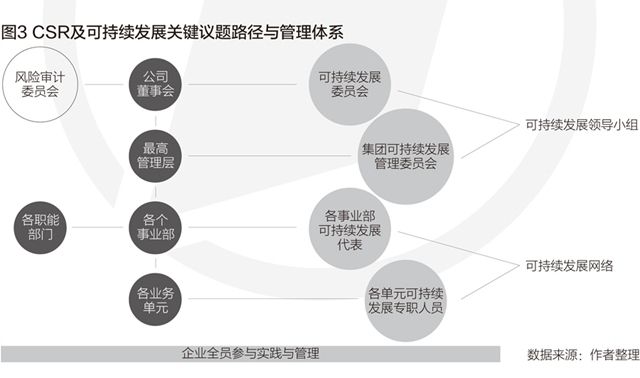 要使这个路径得以实施,还必须有完备的组织体系。图3是一个多年来在可持续发展方面表现优秀的跨国企业的CSR组织体系图。这个组织体系,采用整合式的策略,将可持续发展战略从董事会,到集团管理层,到各事业部和职能部门,到每一个运营地及每一位员工,从目标、流程、岗位到每项运营活动的价值创造的各环节,都贯穿起来;把关键议题融入企业战略、企业运营、企业发展以及利益相关方关系的系统实施当中。路径与组织体系,缺一不可,相辅相成。