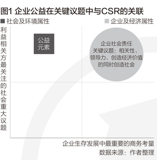 关键议题的确立是CSR战略中至关重要的一环。它通过系统地考量“利益相关方最关注的问题”与“对企业发展最重要的问题”,找出根据企业特点所应承担的社会责任的“切口”,有效合理地使用企业资源,创造社会、经济、环境价值,同时降低运营风险,创造平稳运营环境。关键议题中纵轴,折射出了“公共利益”的元素(图1),反映出了公益的元素。由此可见,公益与CSR有一定的融合度。