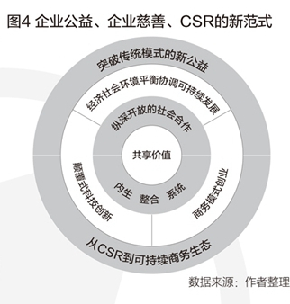 企业公益、企业慈善、CSR的新范式(图4)在总结上述问卷调查和综合分析的基础上,针对未来企业慈善、企业公益、CSR的实践,提出了新的范式。这个范式把企业引入可持续发展指引、颠覆式科技创新、商务模式创新的“商务—社会可持续生态”中,融于其中,因其驱动,通过企业自身的“内生—整合—系统”战略和运行,在纵深方向根植深耕发展,在横阔方向与社会凝聚合作,打开从CSR向可持续发展进发的通道,打开与公益融合的空间,真正扮演好在推动社会进步中的主力角色,发挥出创造力作用,实现在创造经济价值的同时,创造社会和环境效益。 制图/蒋皓明 张逸俊