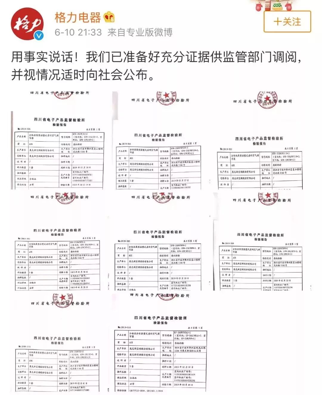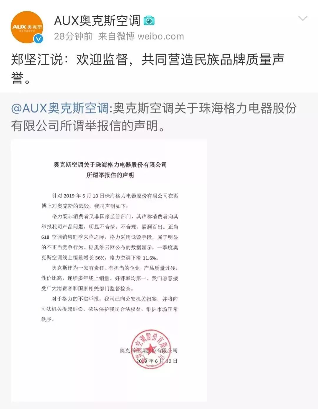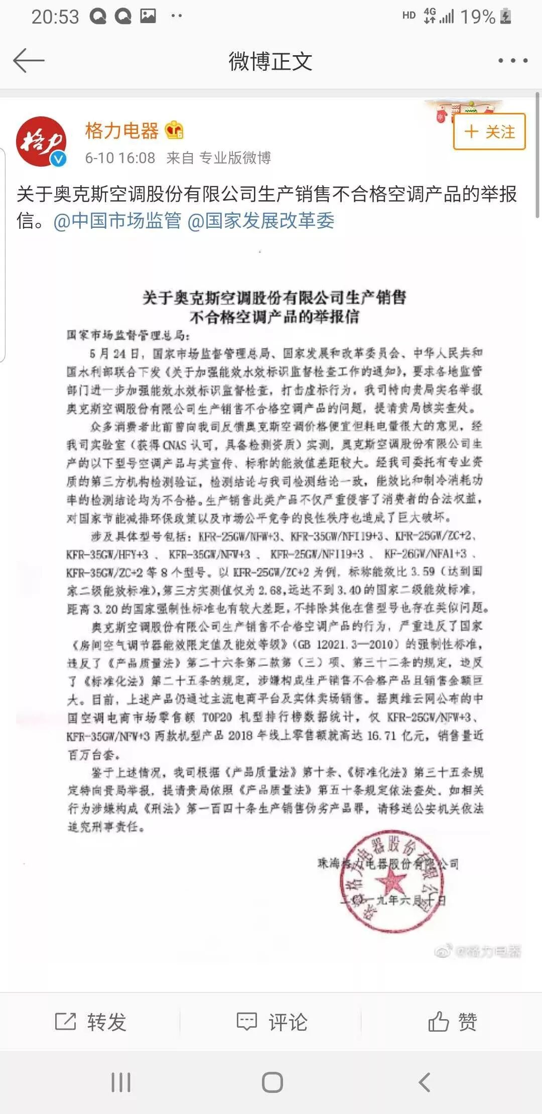 格力电器在官方微博上发布举报信,
