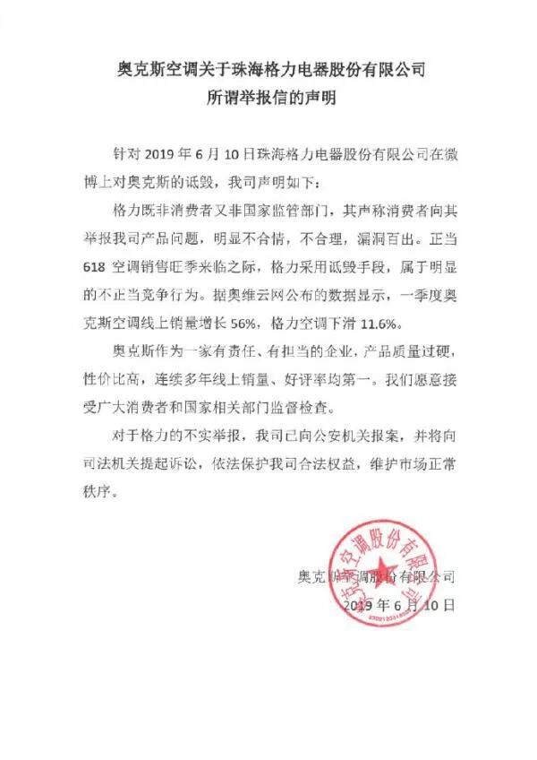 奥克斯表示,对于格力的不实举报,公司已向公安机关报案,并将向司法机关提起诉讼,依法保护合法权益,维护市场正常秩序。