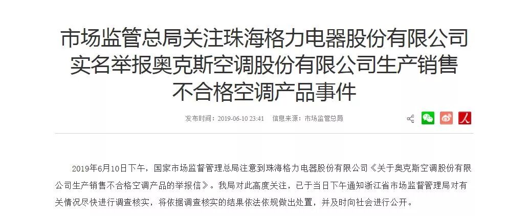 格力实名举报奥克斯!昨晚双方微博互怼!火药味巨浓!国家市场监管总局也回应了!