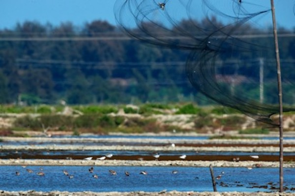 再分享一张伯劳在海边调查时候拍的照片,这也是一块水鸟的重要栖息地,但是几乎每次去都会看见鸟网。伯劳老师拆鸟网时,手都划了很深的伤口,但是没多久鸟网又挂上了。我们向当地林业局反映过,林业局会去处理,但处理之后没多久鸟网又挂上了。那块地水鸟种类和数量都非常多,伯劳老师拆下来的鸟网上挂着鸟的种类就有十几种,但是这样一而再再而三的对峙,日久难免有无力感。