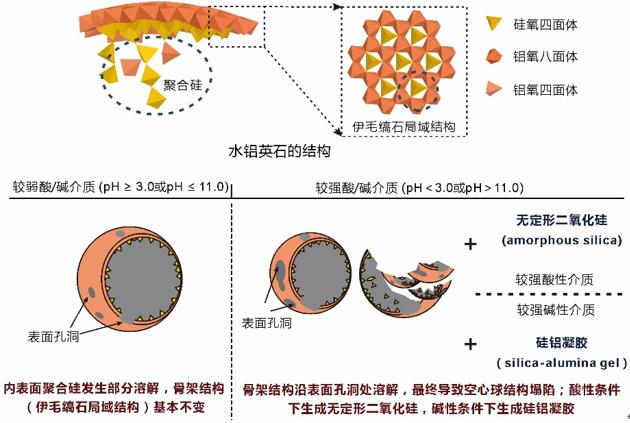 探析了埃洛石、伊毛缟石和水铝英石的若干特殊微形貌和微结构,首次获得其表面原子级高分辨图像;系统揭示了不同酸碱介质中该类矿物的精细结构变化机制,提出其结构中铝、硅局域结构和配位环境对其结构有序度和物相比例的制约最为关键,也是影响其溶解和物相转化的主要因素。