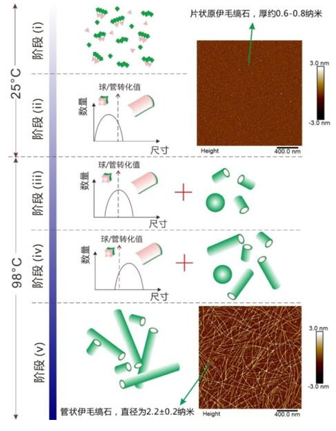 伊毛缟石、水铝英石颗粒超细、结构在电子束下很不稳定,很难用电子显微镜研究其结构。袁鹏等提出了基于原子力显微镜探测伊毛缟石和水铝英石高分辨微结构的新方法,采用该方法“原位”研究了伊毛缟石和水铝英石形成生长各阶段产物的结构、形貌的精细变化,厘清了伊毛缟石、水铝英石和相关过渡相(原水铝英石、原伊毛缟石等)的结构异同及其相互转化关系,发现原水铝英石-原伊毛缟石的转化是决定水铝英石-伊毛缟石转化程度的主要因素。据此,提出了伊毛缟石形成-生长的“五阶段成因模式”。