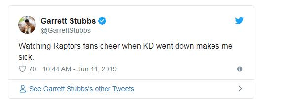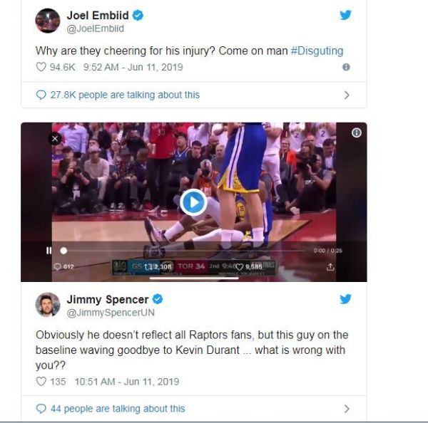 另外,许多人也立即在社交媒体上谴责了这一行为,包括费城76人队的明星乔尔·恩比德。他写道:为什么大家会为受伤欢呼?还有人提到:显然这位对着杜兰特挥手的球迷不代表所有猛龙队的粉丝,但是他到底在做什么?还有人直截了当地在社交媒体上表示:“目睹那些看着杜兰特倒地还欢呼的球迷们真的让我感到恶心。”(编译/赵艳)