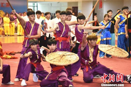 台湾龙华科技大学在狮阵大汇演中展示气势磅礴的宋江阵艺以及精彩绝伦的武艺,引发观众们大声喝彩。据悉,该宋江阵将五行相生相克之意象融入宋江阵创意表演,并加入旗、扇及大鼓等多种道具,融入中国武术和战鼓的概念,重新演绎宋江阵磅礡的表演阵势。