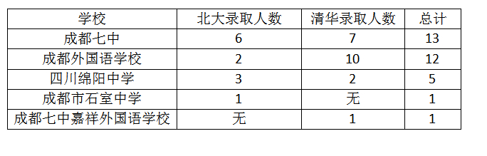 根据统计,今年四川省一共有32名学子被清华大学和北京大学拟录取,包括清华大学20名、北京大学12名。其中,成都占了27人。成都七中人数最多,达到13人。