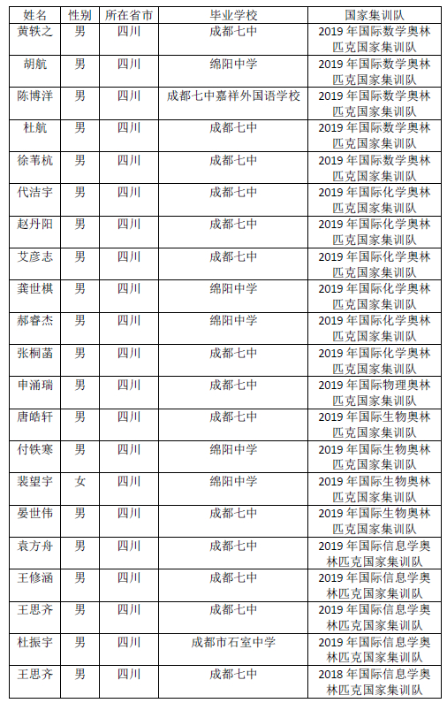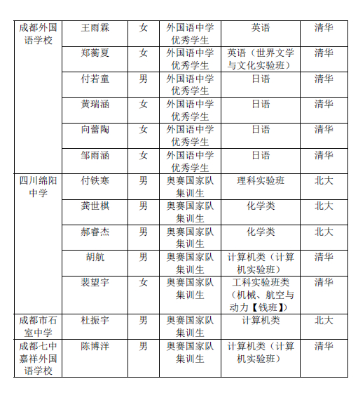 四川省百人名单中的另外20人则全部被清华、北大拟录取,且全部来自国际五项学科奥林匹克竞赛国家集训队员。