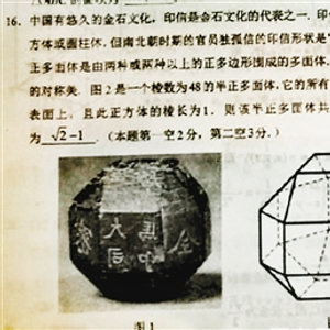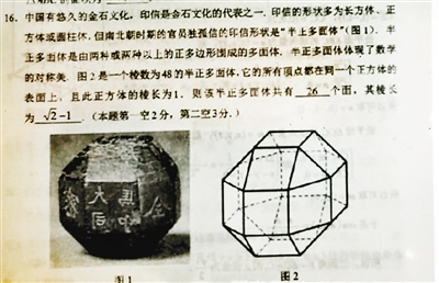6月12日,在陕西历史博物馆里,这枚印信前挤满了人,大家纷纷一睹为快。让我们先看看这道高考数学填空题:“中国有悠久的金石文化,印信是金石文化的代表之一,印信的形状多为长方体、正方体或圆柱体,但南北朝时期的官员独孤信的印信形状是‘半正多面体’,半正多面体是由两种或两种以上的正多边形围成的多面体,半多面体体现了数学的对称美。图2是一个棱数为48的半多面体,它的所有顶点都在同一个正方体的表面上,且此正方体的棱长为1。则该半正多面体共有_个面,其棱长为_____。”