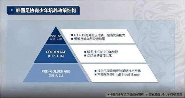经过几年对青少年培养体系先进的法国、德国、西班牙、荷兰、阿根廷、日本等国家的考察和研究,综合各家的长处并结合韩国足球的现状,韩国足协于2014年推出了“Golden Age”训练方案。将球员打破过去以往按照具体年份划分的常规,设置为三个年龄段,即6~11岁(Pre Golden Age)、12~16岁(Golden Age)和17~19岁(Post Golden Age)。