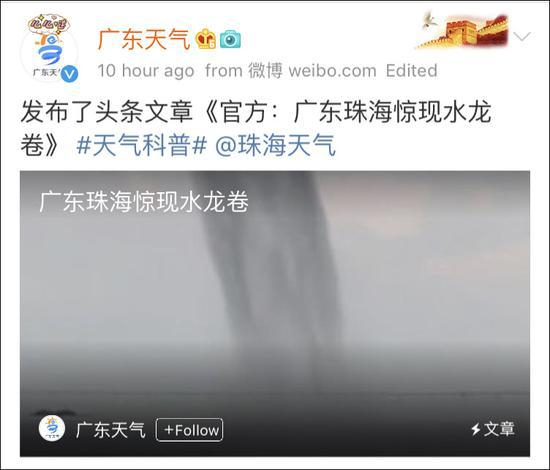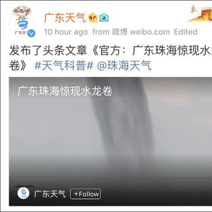 据广东省气象服务中心官方微博@广东天气 消息,6月12日白天,广东出现大范围强对流天气,珠海市香洲区情侣中路美丽湾以东海面上出现了“水龙卷”的天气现象,持续时间约20分钟。