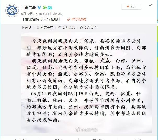 06月14日夜间到06月15日白天,定西、临夏、甘南、白银、陇南、天水、平凉等市州阴有小到中雨,局部地方有大雨;兰州、庆阳两市阴有小雨,局部地方有中雨;省内其余地方多云转晴,其中祁连山区阴有小雨或阵雨。
