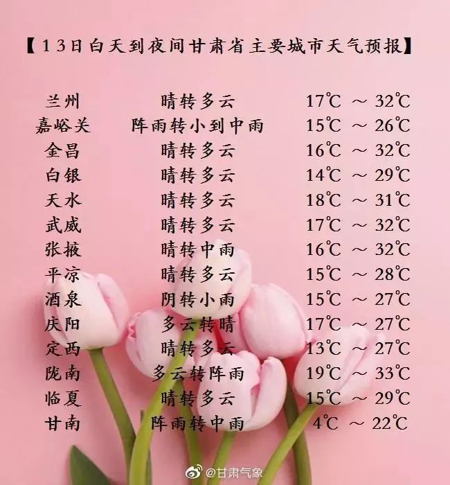 今天夜间到明天白天,张掖、武威、白银、兰州、临夏、甘南、定西等市州多云转阴有小雨,局部地方有中到大雨;酒泉、嘉峪关、金昌、陇南等市多云转阴有小雨或阵雨,局部地方雨量可达中雨;省内其余地方多云转阴,部分地方有小雨或阵雨。