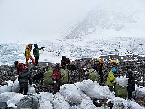 登山者在珠峰遗留下大量易拉罐、塑料袋,废旧帐篷等垃圾,“清洁行动”队员开展清洁活动。(新华社)