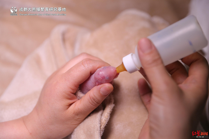 目前,基地派出最强的育幼专家组对小仔进行24小时精心喂养和监护。由于个体太小,它无法在妈妈那里吃到初乳,基地科研人员就想方设法从妈妈那里挤来初奶,为其人工补奶,并随时监测其呼吸、精神状态、粪便等情况。